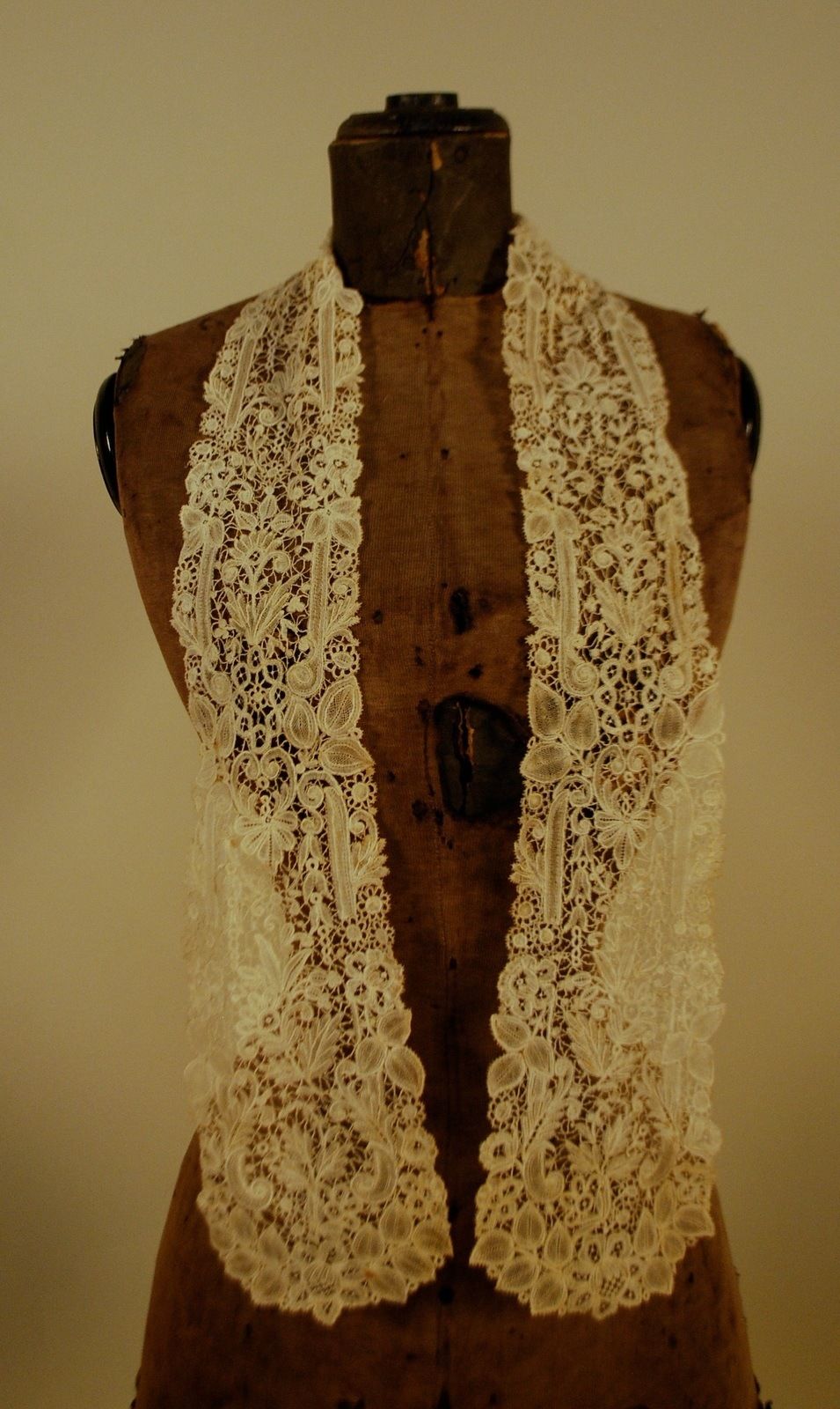 Comments: A dress front of Brussels Duchesse. Raised petal roses in the Point de Gaze inserts, which are fairly elaborate and nicely done. Good raised work in the bobbinlace also. An impressive looking piece.