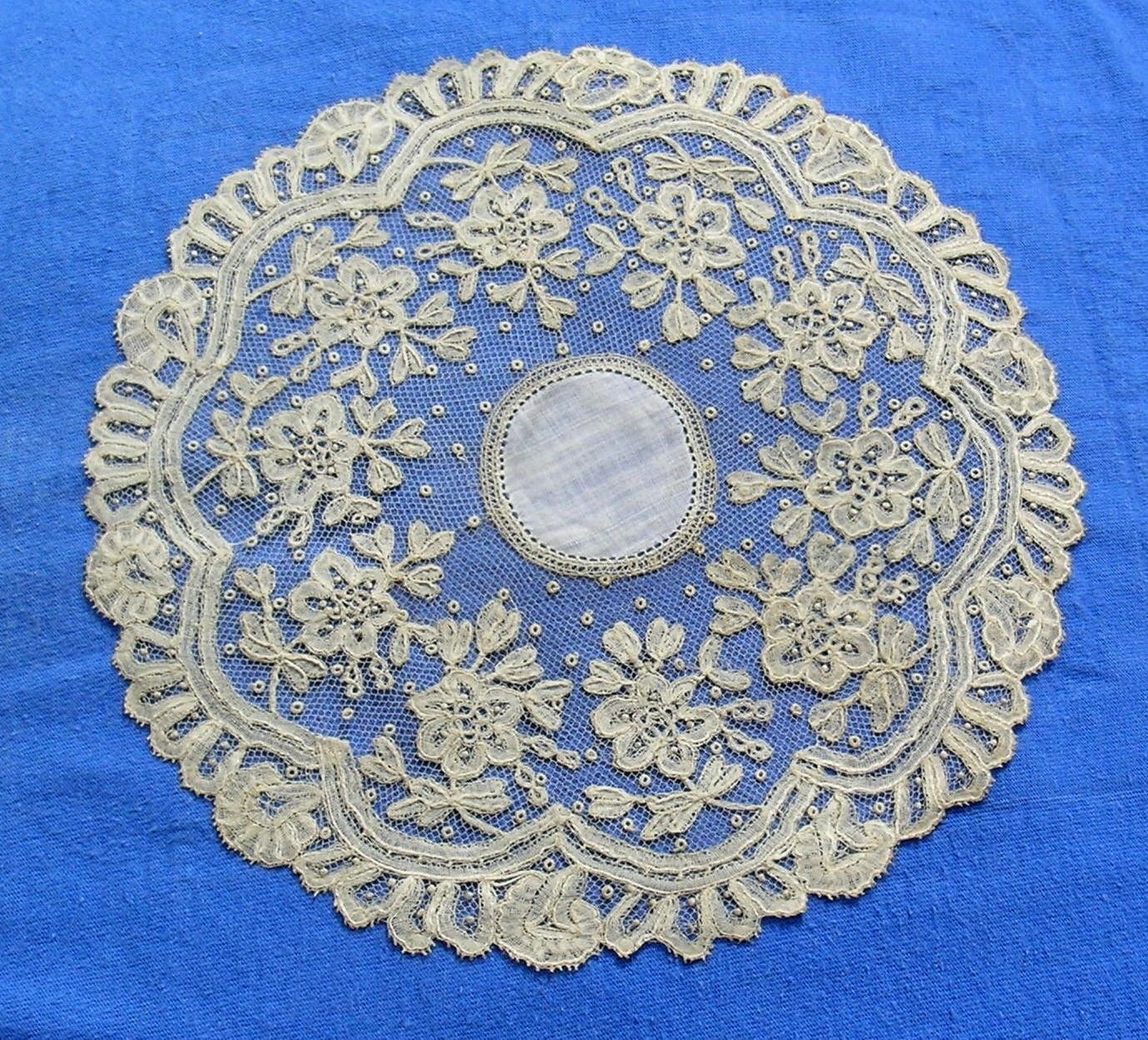 Comments: I agree with the seller, it is rare to find Brussels bobbinlace applique on machine net in this form. It’s just too delicate a lace for the wear expected of a doily. This one is quite well made, with a dense design that looks impressive. Needlelace rings in the ground and simple fillings for the flowers.