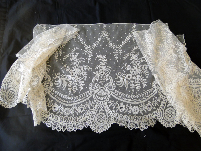 Comments: It looks like a long shawl of Brussels bobbinlace with a droschel ground, probably appliqued. Which would put it before ~1840. the lower edge has a different ground filling, and some interesting spider-shaped fillings. Interesting design of swags and hanging baskets. Note the top and one side edge are finished with additional motifs, but to me the main piece looks cut off before these were added. I think it might be a larger shawl that was cut down into this form.