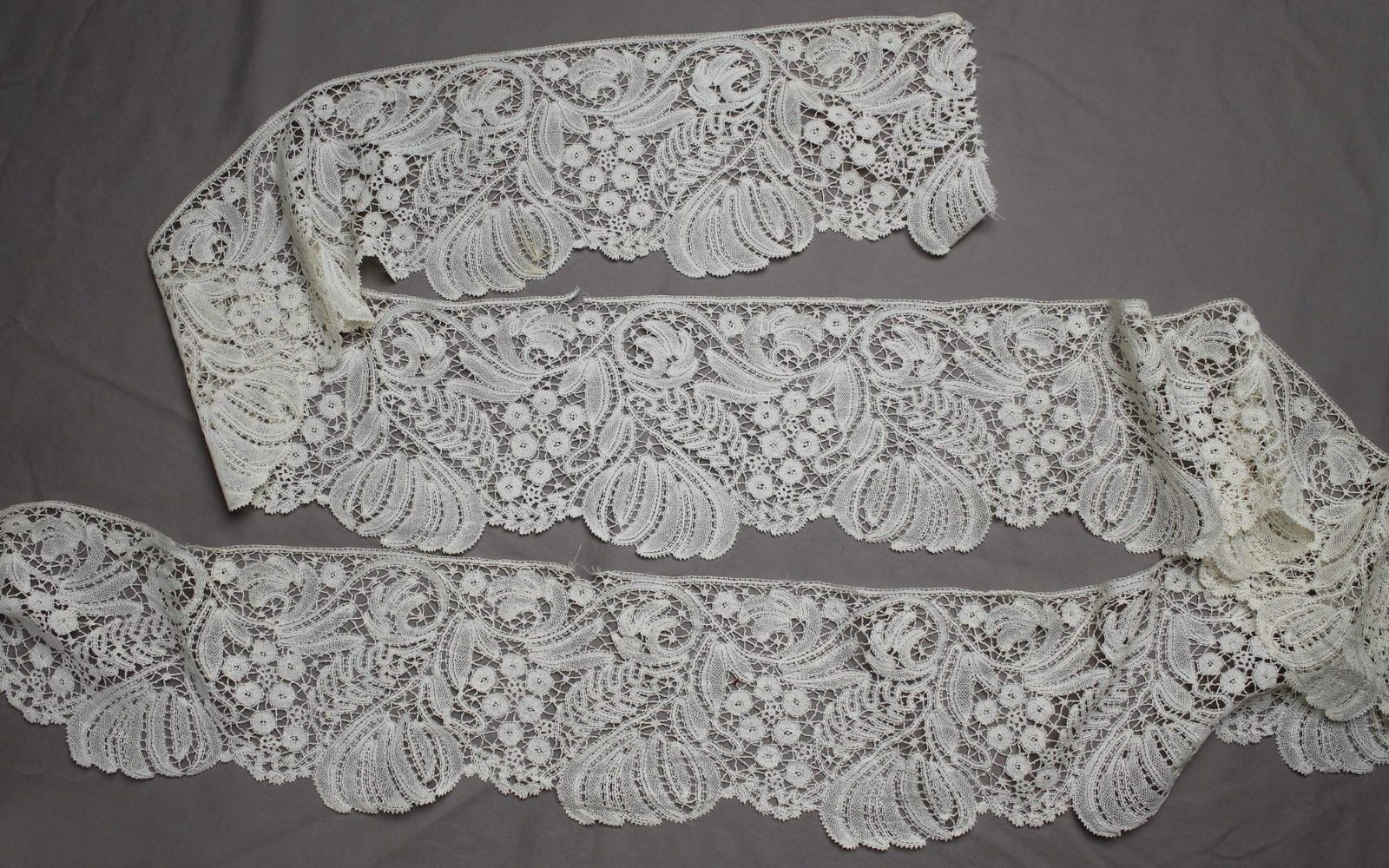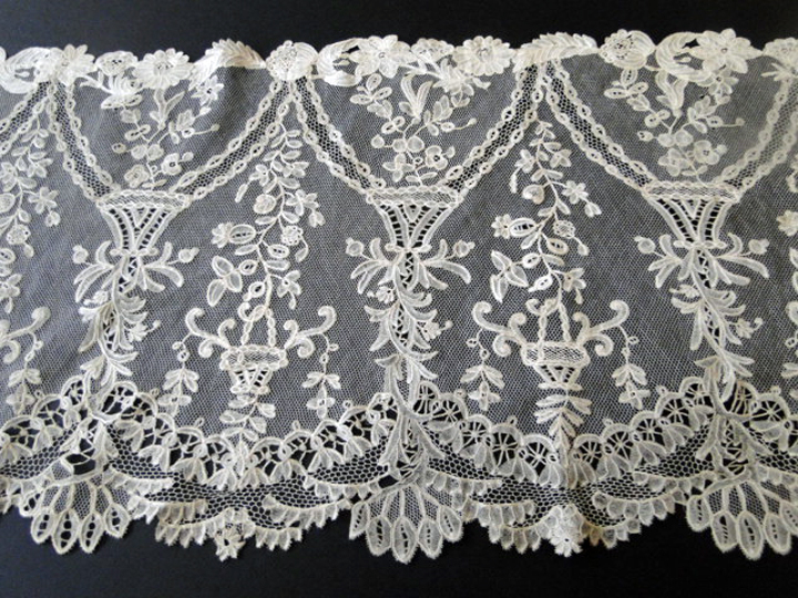 Comments: A Flemish pieced bobbinlace that has the look of 18thc Brabant. However it lacks the mesh ground found in earlier pieces. The picoted brides are very regular, and the overall condition is much better than expected for and early piece. The motifs are quite large with some use of raised edges, but not too much. I’ve been studying a little about Sluis Duchesse, which Sister Judith learned as a girl, and I’m struck by how some of the flowers resemble this technique. Yet the large urn-like motif is so well done that it almost resembles a Valenciennes line-drawn pattern. Quite an impressive piece, and I’d call it later 19th c, and I’m happy to listen to different opinions on this one.