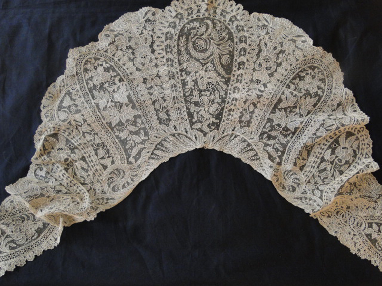 Comments: A kind of shawl collar of Point de Gaze. No raised work, and no elaborate decorative fillings. It relies on well executed naturalistic flat designs, and is quite effective. Much different from standard Point de Gaze. I’ve seen a few small collars and borders in this technique, but nothing this large.