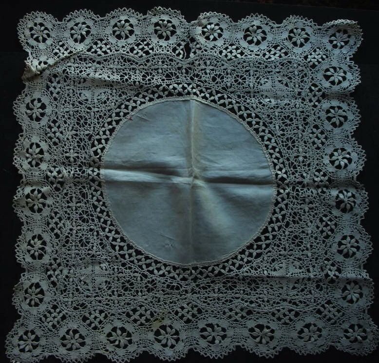 Comments: A Maltese handkerchief – three layers. Outer border is a series of flowers. Crossed woven leaves next to the center. The inner part has an elaborate wire ground, cross in the corners and some isolated woven leaf crosses between. It all works quite well.