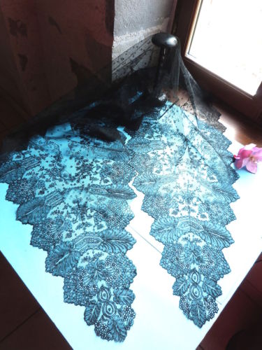 Comments: This looks like a narrow triangular Chantilly shawl, but the photos aren’t close enough to really determine if it is handmade. But what I can see has a correct feel. There is also no photograph of the back, so hard to tell the overall pattern. Seller calls the flower sprays ‘hortensia’.