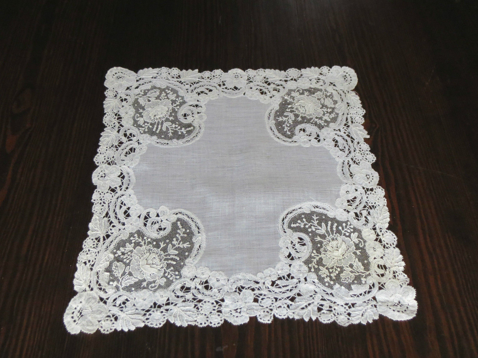 Comments: Another Brussels Duchesse handkerchief from the previous seller, this one with raised petal roses in the rather large Point de Gaze inserts. Again, notes say it was lent for exhibition at the Detroit Institute of Arts in the 1920’s. In this piece, the Pt de G is a bit more elaborate than the bobbinlace.
