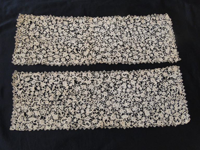 Comments: Two pieces of fine raised needlelace, probably cuffs, and they appear to be 19th c. I’ll go with Belgian on this one, basically because of the chain of rings in the centers of some flowers, and also the good openwork fillings. The photo’s aren’t close enough for one good test, that is if the cordonnet is buttonholed on with spaced stitches (as opposed to being covered with stitches worked tightly together), that’s a pretty sure sign of Belgian work, and is also done in Point de Gaze. Nice treatment of the brides with the little picoted loops, which mirrors somewhat the edge work.