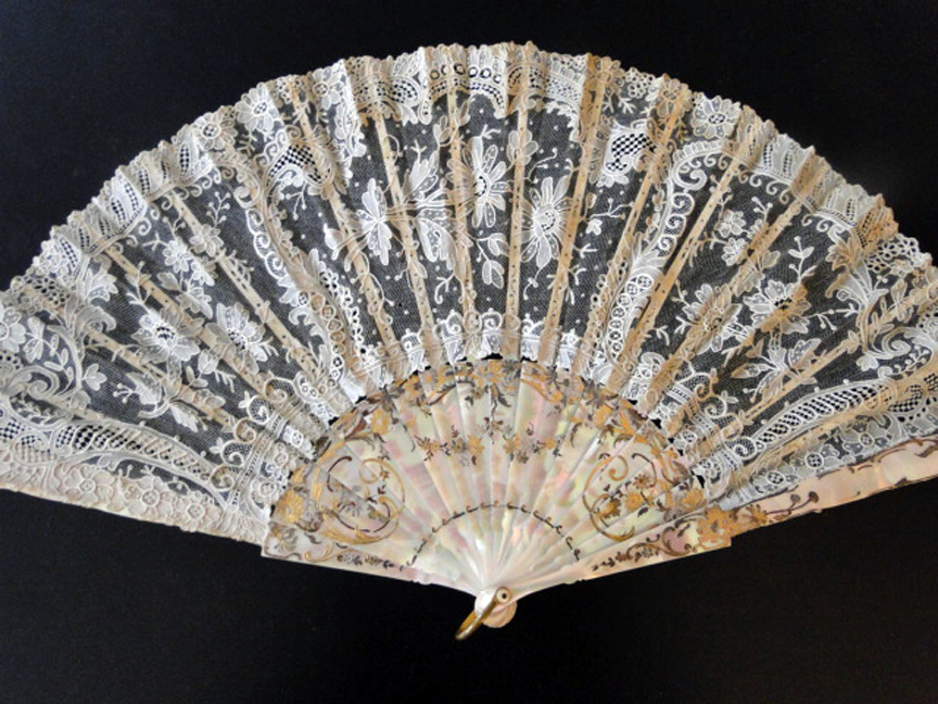 Comments: A Point de Gaze fan with elaborated embossed Mother of Pearl (Abalone) sticks. Good naturalistic design in the lace. The decorative fillings are a little plain.