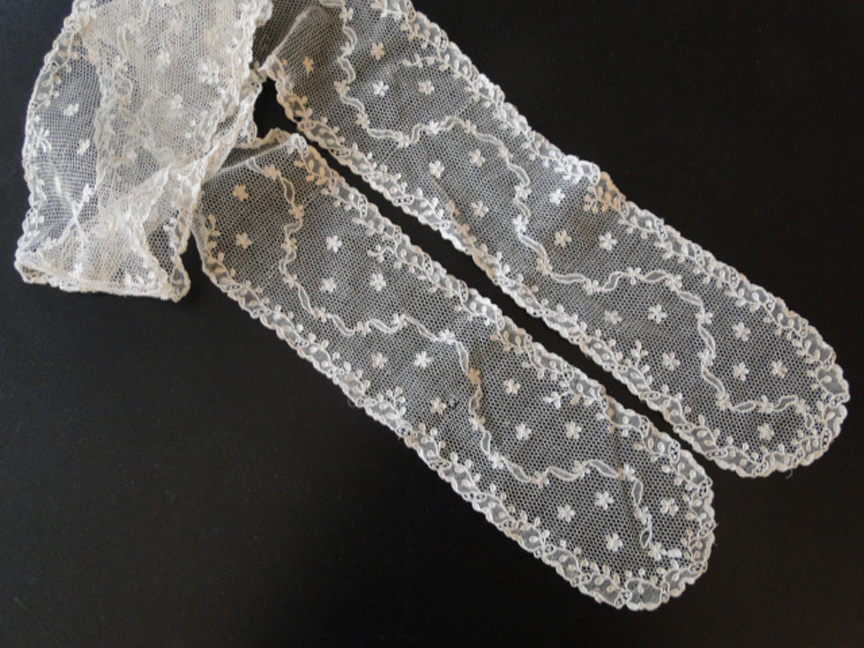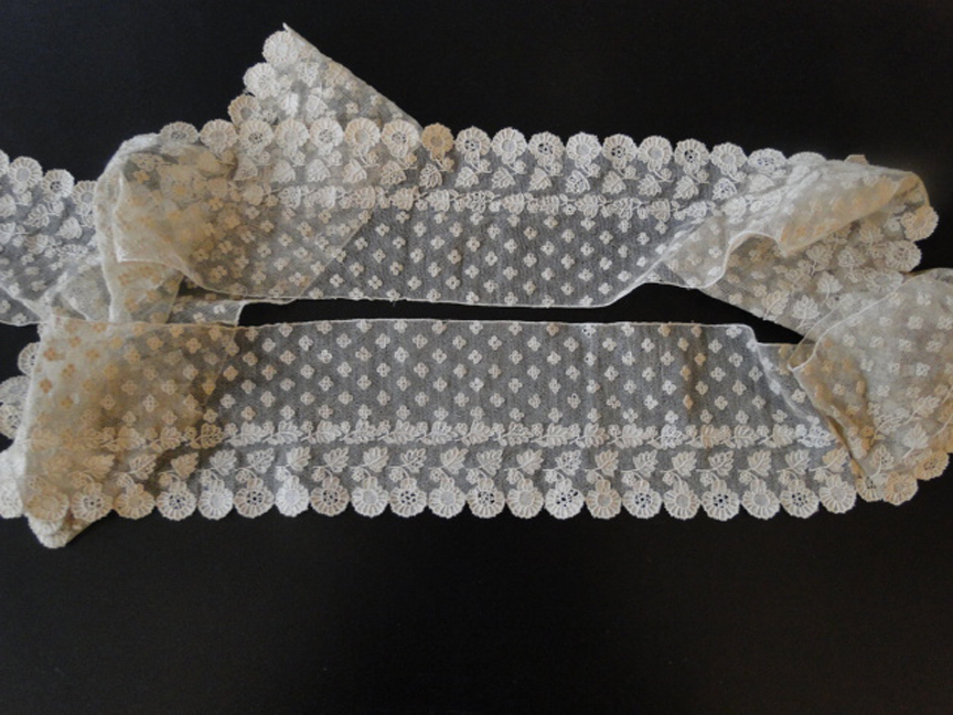 Comments: Alençon lappets, joined together (although I can’t see the join in the photos.) Typical later 18th c design of a narrow border with sparse design in the center. Brides tortillée, maybe with 1 or 2 buttonholes per side. Looks rather plain, but that was the style. It’s finer technique than it looks in the photos.