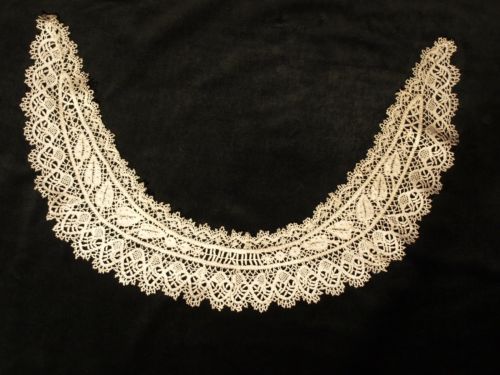 Comments: A Honiton collar. Guess you could call it a Point Honiton since it looks like the brides are buttonholed over, and are in a loose hexagonal mesh. Snails/slugs style, and some fillings are rather narrow tallies, like long oval leaves. Others are more square. Overall a nice looking piece.