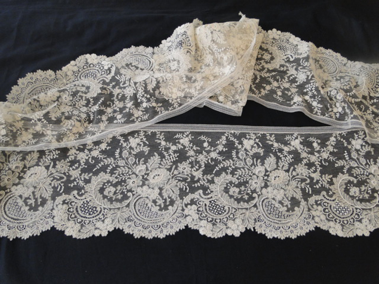 Comments: A reasonably wide, long Point d’Angleterre border. This lace combins bobbinlace motifs with a Point de GAze ground and the best has extensive decorative ‘mode’ needlelace fillings. This is an excellent example – I’ve never seen some of the fillings before. Note also the raised rings at the centers of the small flowers, almost like Rosaline. It’s a later 19th century lace, one of the best of the Belgian mixed laces.