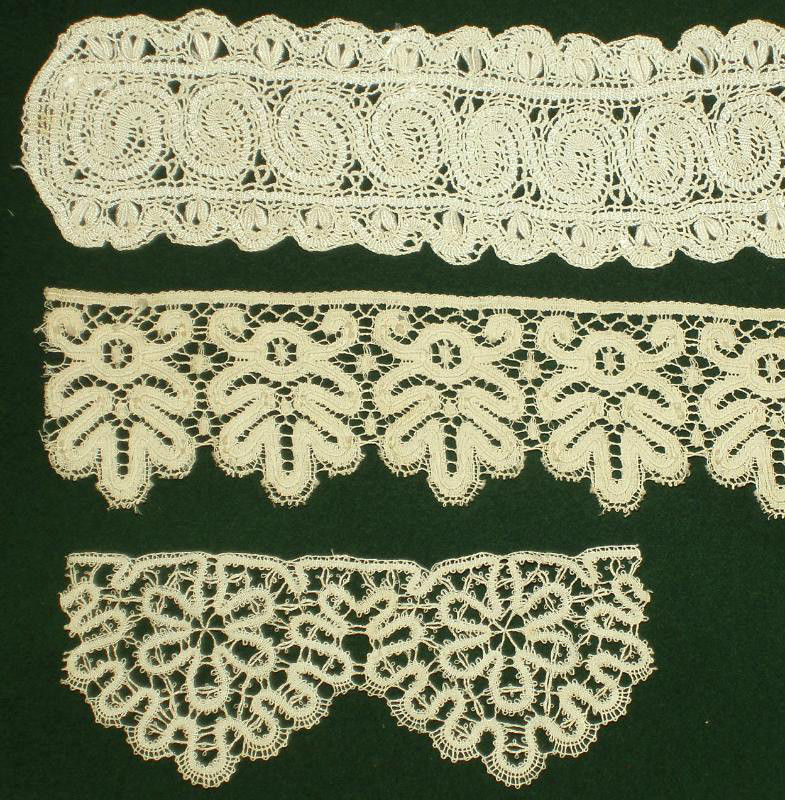 Comments: This seller is listing five lots of Eastern European lace, and when the seller is an Eastern European textile specialist, you pay attention. Attribution is a bit confusing – Czech, Russian, Italian, Hungarian, Croatian, Slovenian? I’ll speculate that at least in technique last two are Russian tape lace – bold good designs. Note the heavy thread down the center of the tapes in the last one, a Russian technique. The bottom two of the third listing also look Russian, the top one look more Czech or Slovenian.