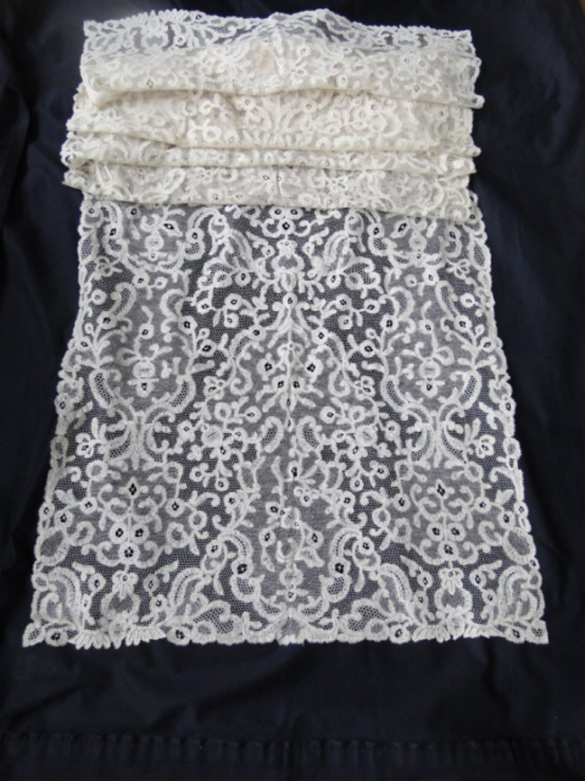 Comments: A wide border of Chantilly – really very wide, even for Chantilly. One end looks finished, but I think someone has sewn another piece on to make it look finished. Interesting pattern of bows, swags and flowers – no esprits in the upper ground. Salvaged from a ‘mourning garment’, wish there were more information on the garment which might help with dating.