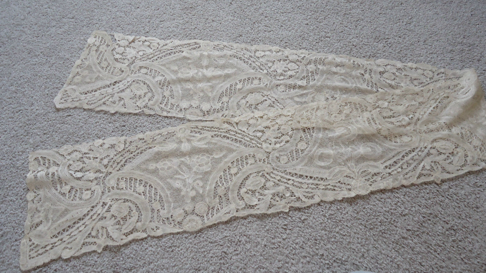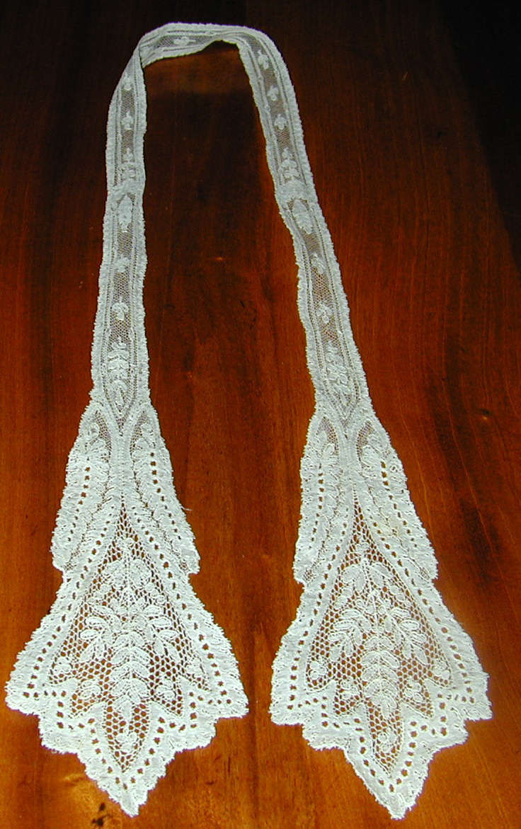Comments: A point ground bobbinlace lappet scarf. I’m guessing a Lille piece – kind of a Beveren style. Note the kat stitch used on the ends, regular point ground in the connecting band. But the heavy outside border with the eyelets is something you also see in Beveren.