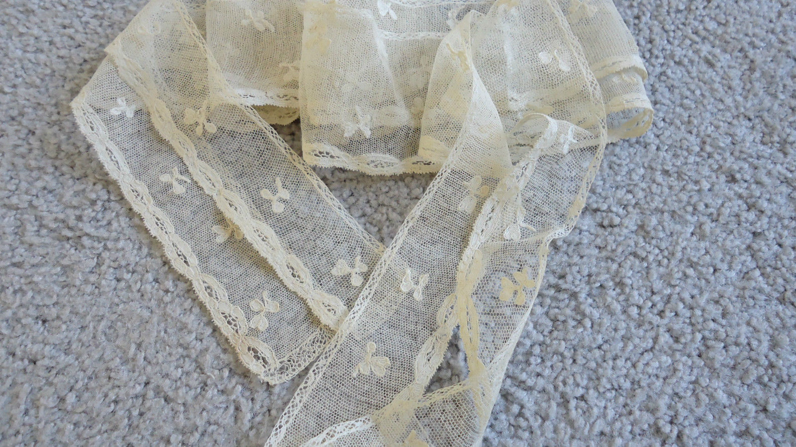 Comments: A border of Honiton Point lace, meaning Honiton motifs joined with a needlelace mesh. Figurals of butterflies. The style is rather on the snails/slugs side.