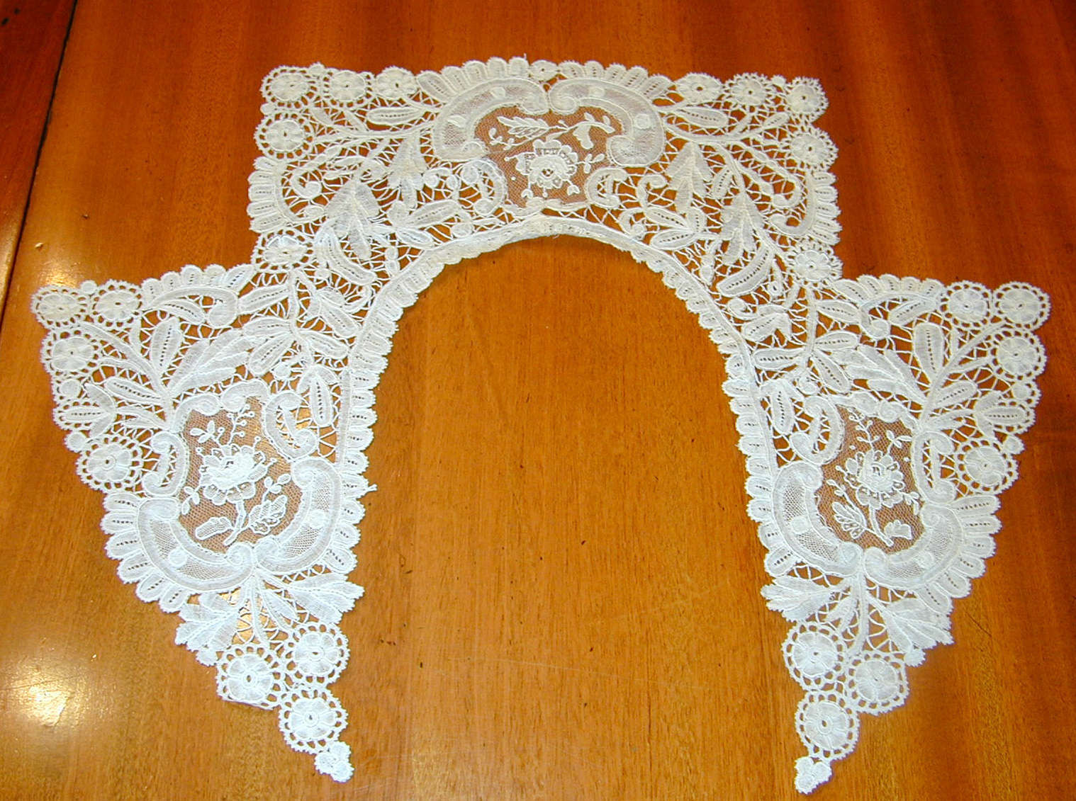Comments: A Duchesse de Bruges bertha – no Point de Gaze needlelace. There are a few simple needle-done fillings. Interesting, the motifs all go around the bertha facing the same way, which looks a little odd at the ends. Nothing serious. Conventional Duchesse motifs.