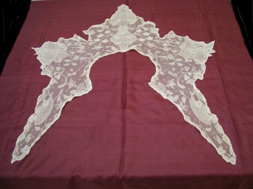 Comments: A large collar of embroidered net, perhaps Limerick. Good needlerun motifs, with some figural work of butterflies. Interesting pattern of very large and very small motifs.
