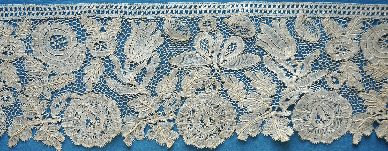 Comments: A long border of bobbin tape lace with 6-pointed star ground. Much like early Milanese, but the overall design, fillings, and edge treatments argue more for an Eastern European origin. It has some interesting woven ‘tally’ fillings, which you would also not see in Italian work.