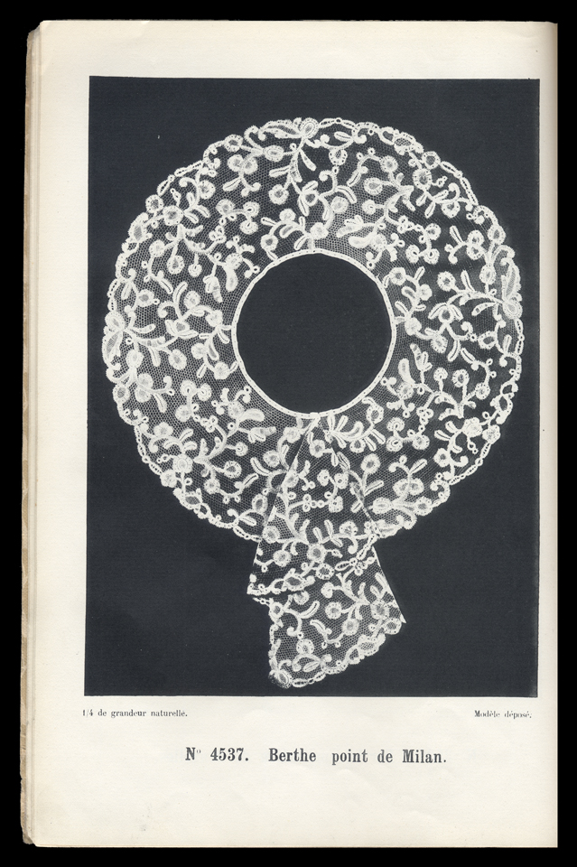 Comments: A rectangular shawl of a later 19th century lace which goes under the name Point de Milan. See the photo on the right which is a page from a contemporary catalog showing a bertha of the same type of lace. The quality of this kind of lace can vary widely. It is basically a Bruges-type pieced bobbinlace with needlelace mesh of various types. The photos on this one aren’t close enough to really examine the mesh, but I’ll speculate that is what it is. This shawl has a good design and precise work – a good example of the type.