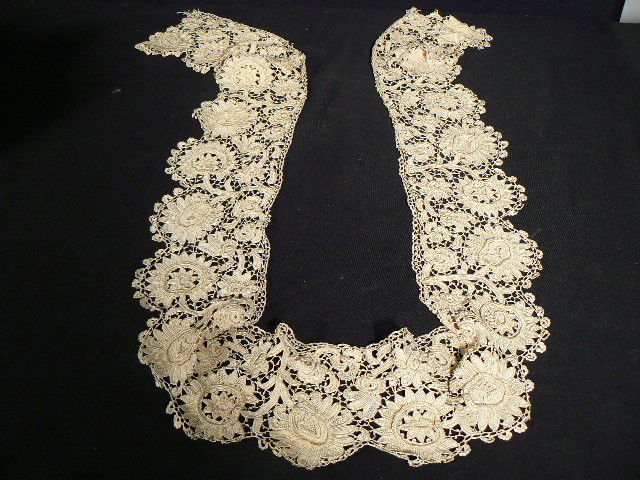 Comments: A dress front of Venise needlelace. Given the loosely buttonholed cordonnet and the way the rings are made, probably again a Belgian piece. Fairly typical design, picoted brides, some simple variations in the clothwork.
