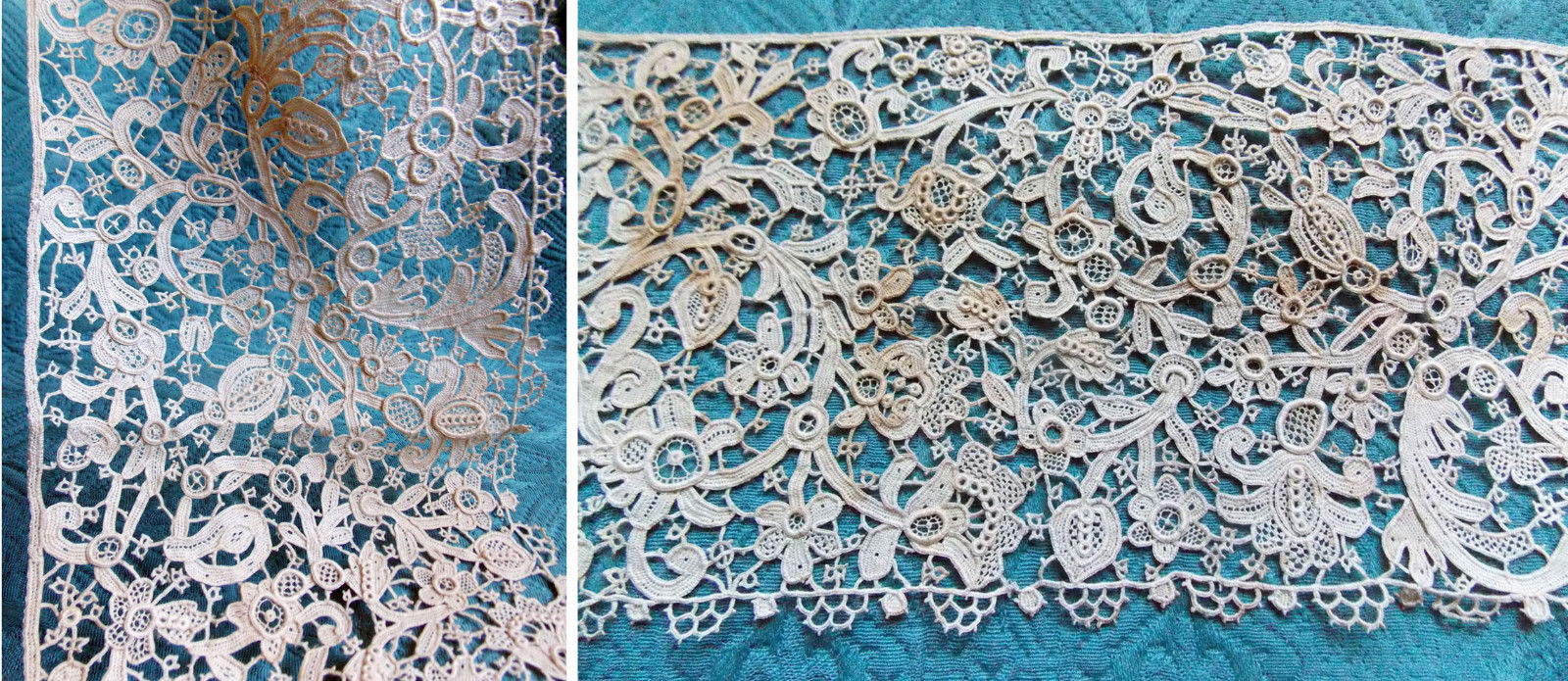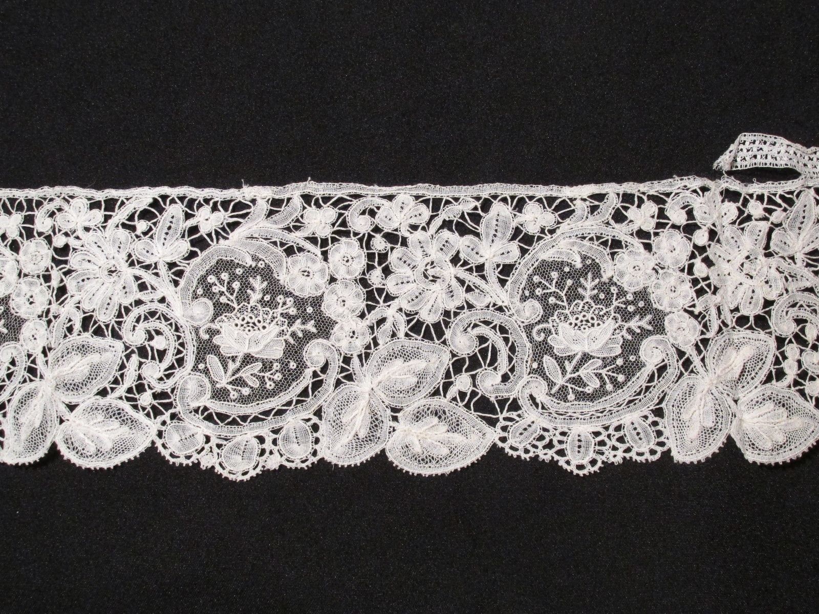 Damage: One break in the header of one piece just where engrelure starts to go missing. Pt de Gaze mesh looks intact except for one hole. One separation in the leaves along lower border – minor.