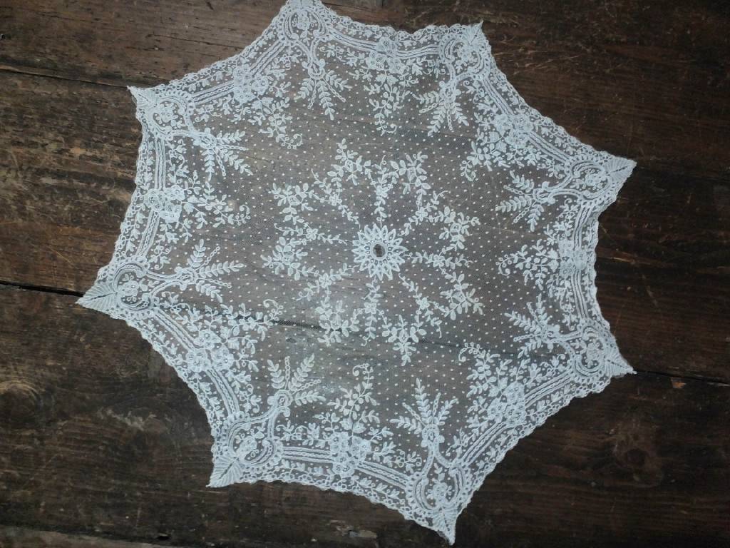 Comments: A parasol cover of Brussels bobbinlace application on machine net. Good romantic design, eight-pointed geometry. Note the extensive esprits in the ground – this is a higher end market product. I think it is finer than it looks from the photos due to the small size. These don’t come up very often, especially not in this good condition.