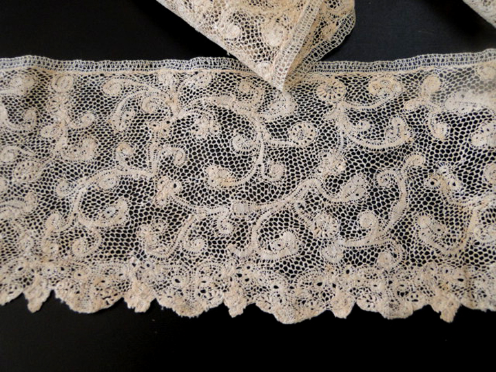 Comments: The lace looks like a Flemish tape lace with an irregular reseau, almost a droschel ground. Note some of the heads almost look like they have square tallies around the center – not enough closeups to tell for sure. This one is a puzzle, but it looks 18th c.