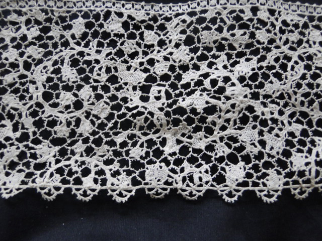 Modifications: Can’t tell if ends are cut. Looks cut down from a larger piece. Bobbin-made engrelure added later, probably also the bottom looped edge.