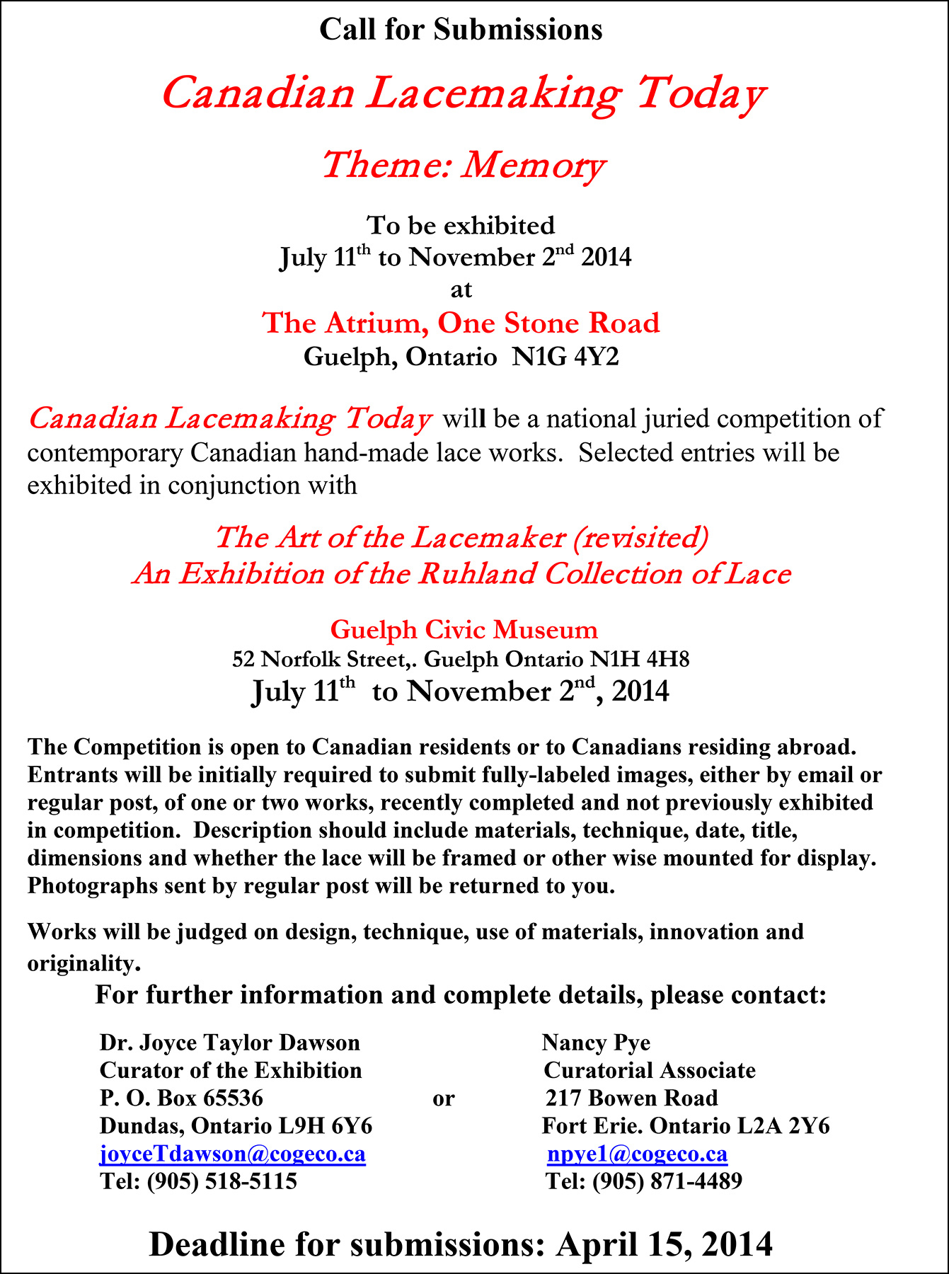 The entries from this national juried competition will be exhibited in conjunction with the exhibition “The Art of the Lacemaker (revisited), An Exhibition of the Ruhland Collection of Lace”, July 11 to November 2, 2014, at the Guelph Civic Museum, Ontario, Canada. A detailed announcement of the exhibition will follow this post (http://tinyurl.com/m8juxkh). The contest is in memory of the late Margaret Ruhland of Ottowa, who passed away unexpectedly in March, 2013. The exhibition will take place at The Atrium, One Stone Road, Guelph, Ontario N1G 4YU, from July 11 to November 2, 2014.