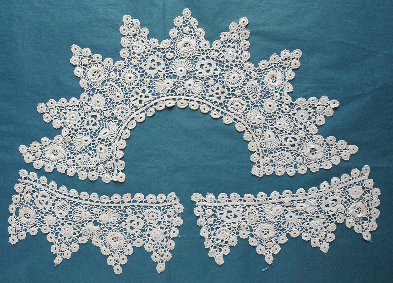 Comments: Irish crochet collar and cuffs, which match. Note the seller’s comment, that they are quite loosely worked and floppy. Probably a result of the kind of thread used, or more of an amateur effort. You also see this in silk Irish crochet, but I don’t think that’s the case here, despite the many raised rings which are a mark of silk work. The motifs are interesting, the rings well done, and it has the kind of geometric look that is sometimes found in IC. Probably a later work.