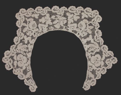Comments: A Honiton collar with needle-made ground, which puts this into the Honiton Point category. A little snails/slugs style, with nicely made roses and thistles, good symmetry to the design. The ‘lily of the valley’ flowers are unusual.