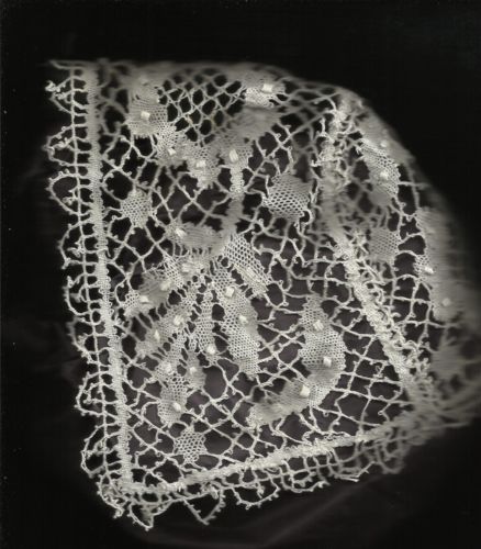 Comments: A small baby’s cap of guipure bobbinlace, probably a Cluny type. As the seller points out, the thread is a little heavier than found in Beds. Good floral design for the type, with raised tallies. Unusual to see a piece like this.