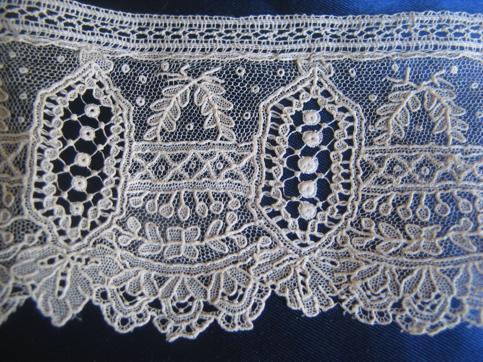 Comments: A Honiton Point flounce, needle-made ground. The motifs have some raised work, with typical roses, thistles, and I think Oak leaf motifs. Rather on the snails/slugs style side, and I think it’s a later 19th c piece. it has a nice presence. The foot edge treatment is a bit unusual, not easy to sew this to something along that edge.