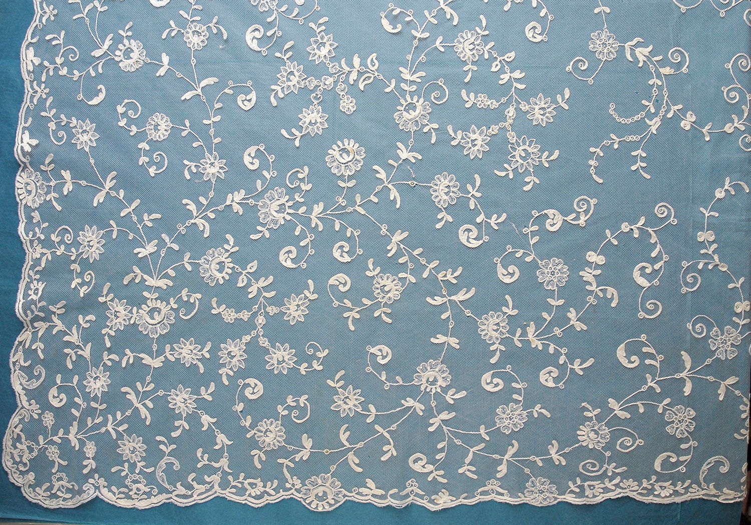 Comments: A square veil or shawl of tambour embroidery on machine net. Nicely worked with both heavy and lighter shading stitches. Work like this is sometimes ascribed to Belgium. Seller notes that the density of the embroidery makes the piece a bit heavy, but it looks like it hangs well on the manikin.