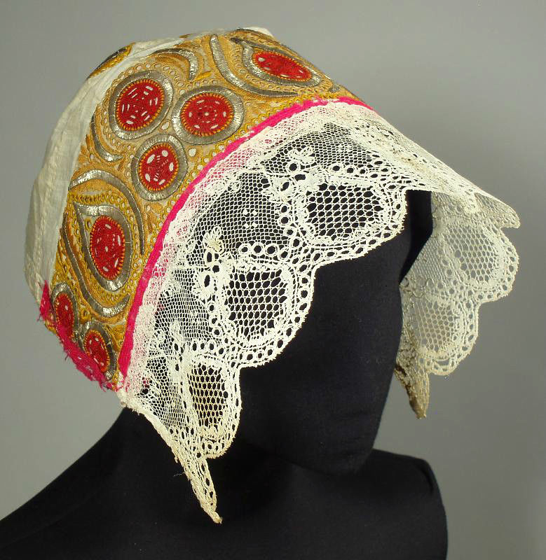 Comments: A very interesting piece, with metallic and other embroidery on the cap. I don’t recognize this point ground lace border in the context of Slovakian lace – it looks more like a Lille design. Still, something like this doesn’t come up very often, and it is beautifully made and quite impressive looking.