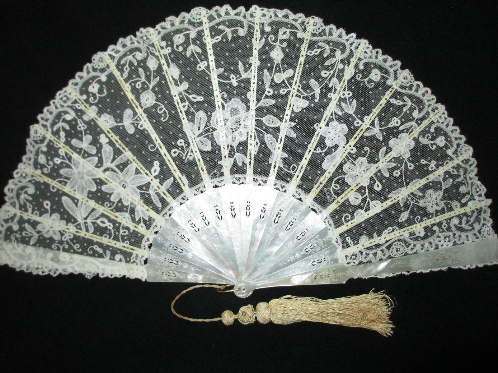 Comments: Fan with Mother of Pearl (probably Abalone) pierced sticks. Brussels bobbinlace applique on machine net. A few needlelace accents in the fillings, and small rings used as ‘esprits’. The motifs are typical for this lace.