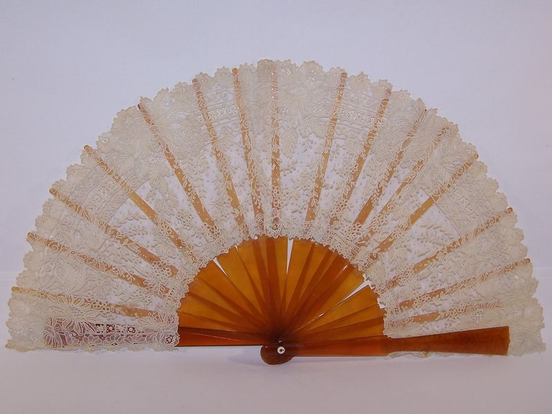 Comments: This large Duchesse fan apparently comes with a box. No needlelace that I can see, so this is more the Duchesse de Bruges style. A little raised work in some motifs, overall they are quite typical of Duchesse.