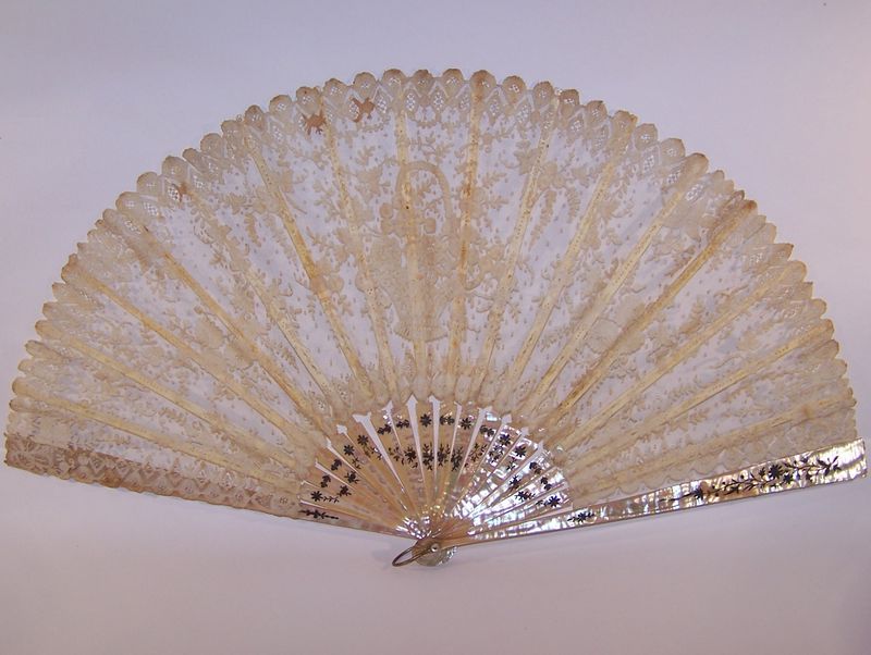 Comments: A fan of Brussels bobbinlace applique on machine net. Needlelace fillings used as accents. A delicate design, note the elaborate flower basket in the center. Rather elaborately decorated Mother of Pearl (abalone) sticks.