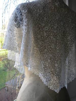 Comments: A small Irish Crochet cape. The design has many elements of early ‘imitation guipure’ crochet, with small motifs, the ‘fan-like’ connecting structures, and crocheted loop picots. No sign of the horseshoe motif which is often found in this kind of lace. It is often made in large textile-like structures.