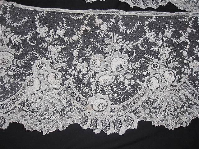 Comments: A long Point de Paris border with straight lower edge. It has a delicate floral design with some areas of point ground used as fillings. Somewhat lighter in appearance than most Point de Paris.