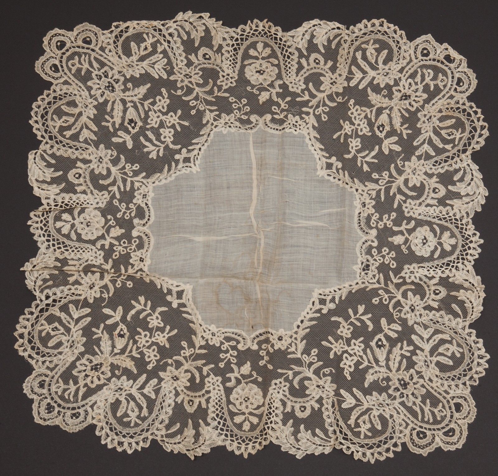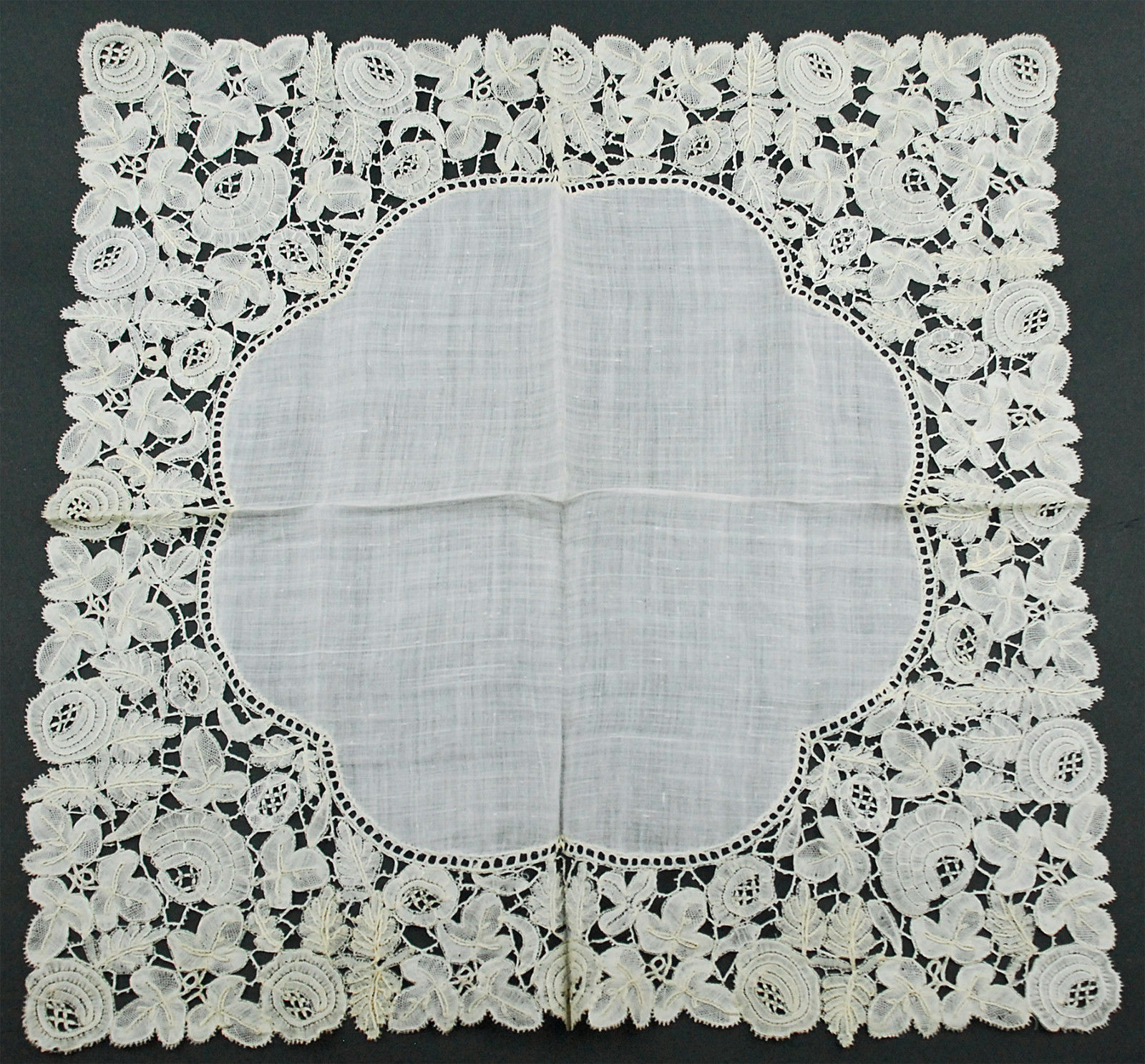 A Brussels bobbinlace handkerchief applique on machine net, typically fairly large size for this lace. Good romantic design, fairly small motifs, a little loosely worked. But a nice overall presence.