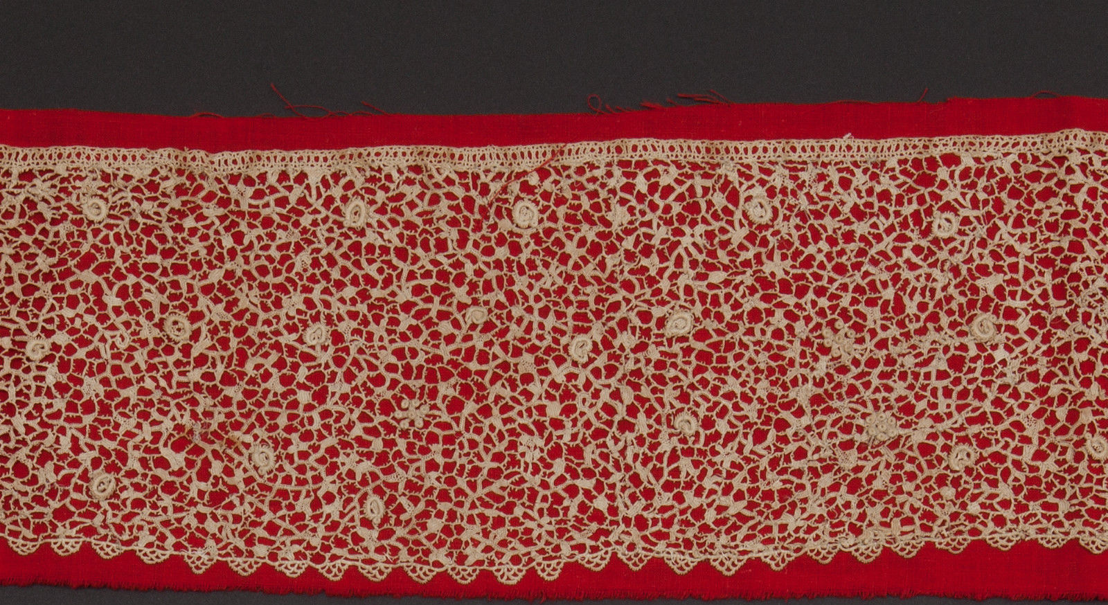 Modifications: Both ends look cut, but secured. Picoted edge is a later addition.