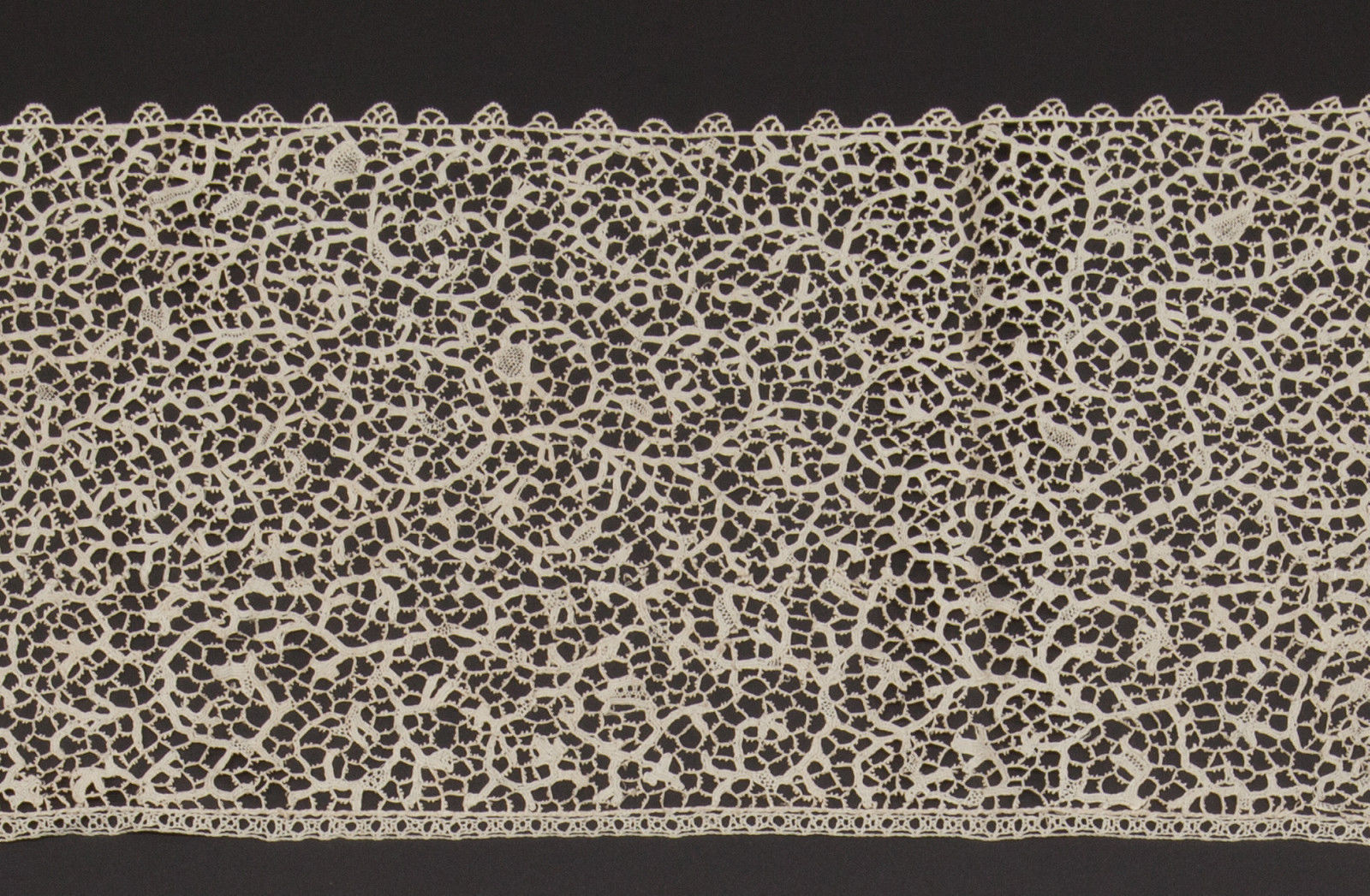 Comments: A narrow scarf of Brussels bobbinlace application on machine net. Standard romantic design of flowers and leaves, with good esprits in the mesh. A nice typical example.