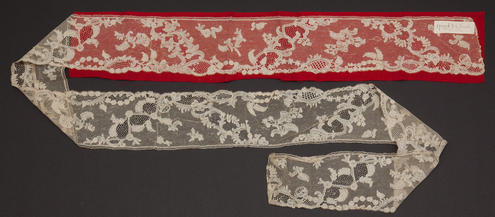 Comments: A border of Brussels bobbinlace with droschel ground. There’s always a chance things like this are English, but it can be a very hard call. Typical later Louis XV design, which is starting to open up into a lighter field. My instinct says Belgian – probably.