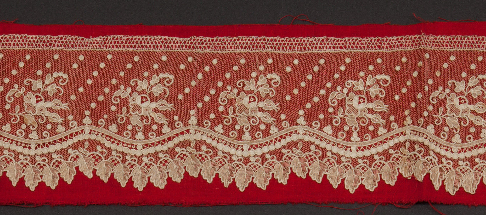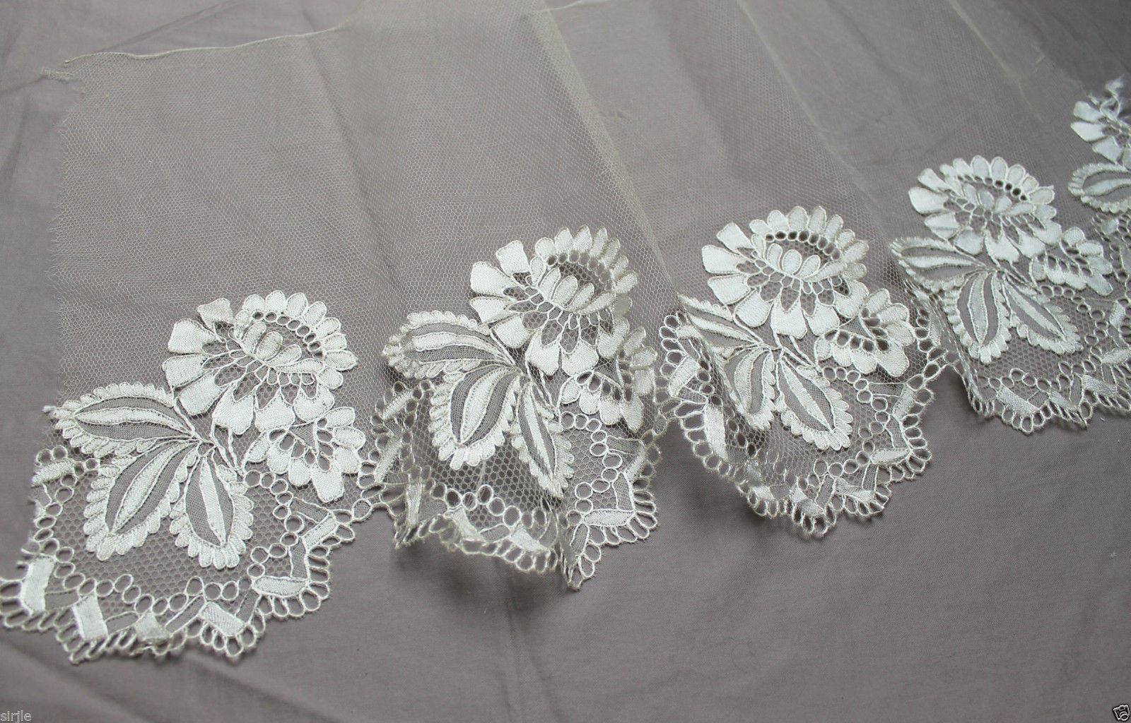 Comments: A border of Brussels Duchesse with raised petal roses in the Point de Gaze inserts. Standard Duchesse bobbinlace motifs with irregular brides. Minimal raised work, almost a Bruges look. Good typical design and technique.
