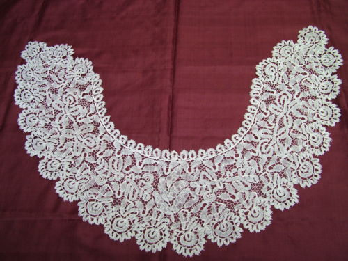 Comments: A small collar of pieced Valenciennes, sometimes called Valenciennes de Gand. The square mesh is worked around the motifs, and is normally a 3-thread plait. Not enough fine closeups to tell exactly here. There are also a few picoted brides – unusual. Note the half-stitch shading in the leaves along the neckline. Mid 19th c.