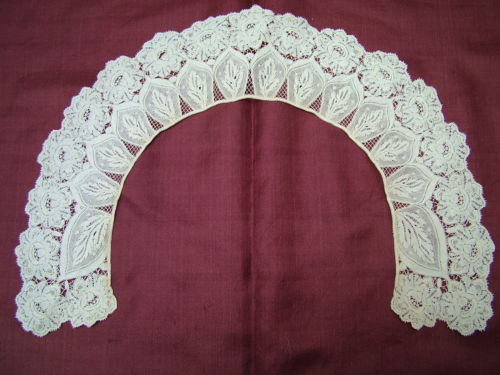 Comments: A rather busy Honiton collar with what I think is a needle-made mesh. Turkey-tail border with some meandering leaves in the center section – simple loops around the neckline. Somehow it all works.