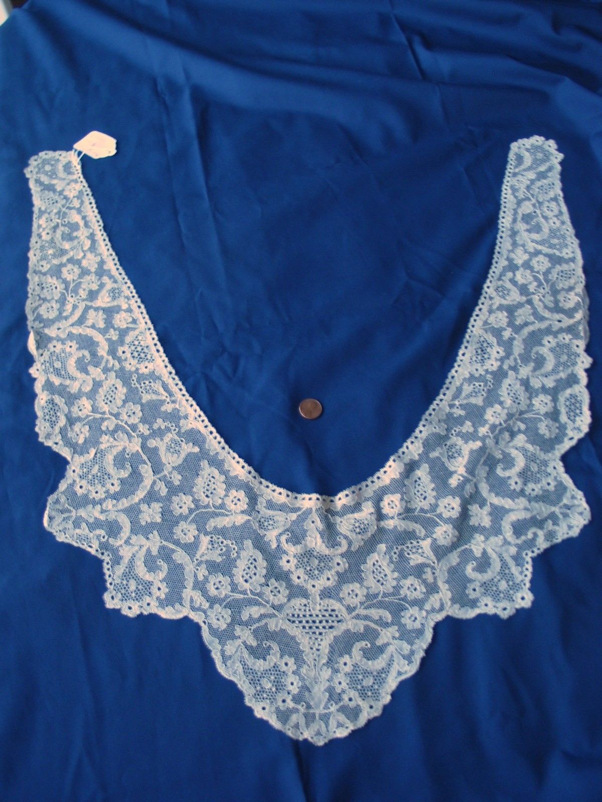 Comments: A collar of Bucks point bobbinlace – a good example of a shaped point ground piece. I don’t see any mayflower fillings, just honeycomb and a vertical bar and tally filling, diagrammed by Nottingham in “The Technique of Bucks Point Lace” in figure 216. An interesting design, nicely worked.