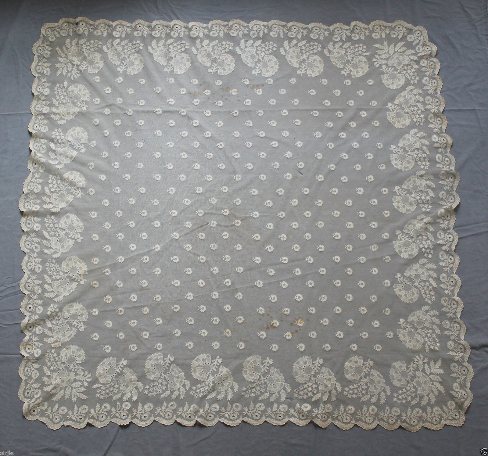 Soilage: Dark stains on the lace extending into the center cloth.