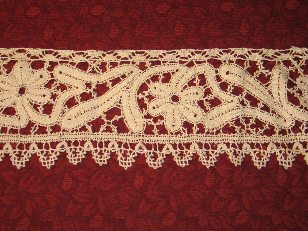 Comments: A narrow guipure scarf, which doesn’t look like a typically Maltese design. I’m thinking it could be French or German. The thread has a linen look. I call these laces ‘indeterminate guipures’, and we definitely need more information about them.