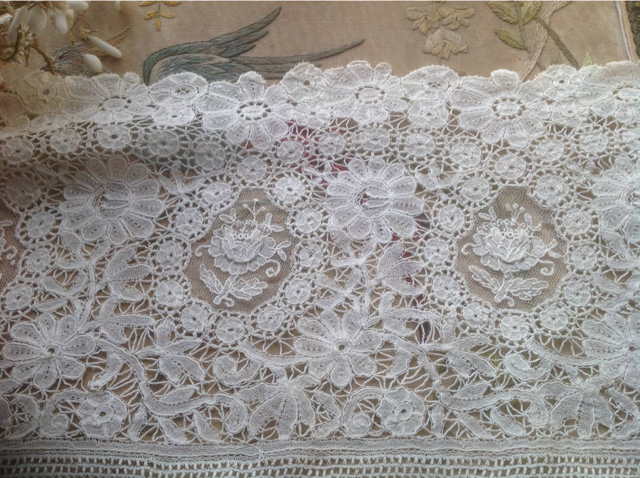 Comments: A border section of Blonde de Caen. Typical large flower designs with extensive honeycomb fillings, also half-stitch relief. An impressive looking piece, wish there were more.