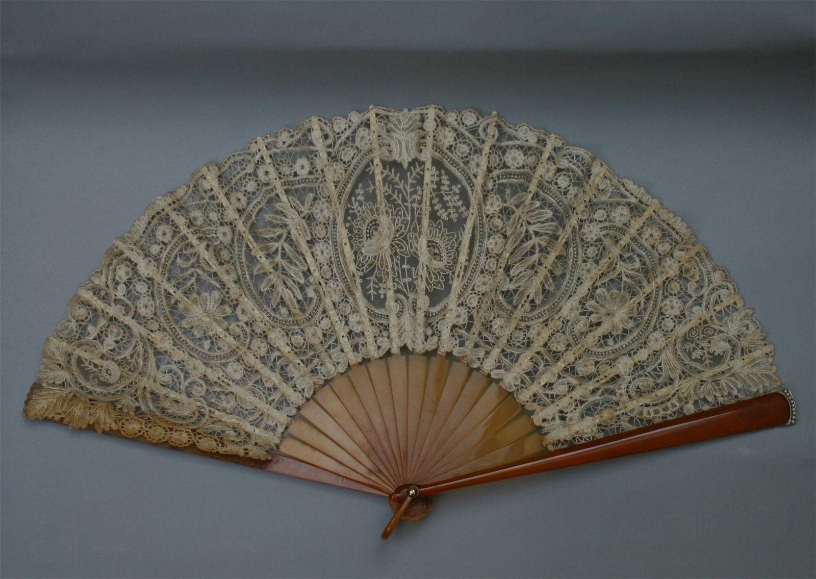 Comments: A fan of Brussels Duchesse with blonde sticks and some pearl embellishments. Raised rose petals in the Point de Gaze inserts. Good design, note the large center Point de Gaze insert. Wish I knew more about the lace import business in South America – but we may be about to fix that… stay tuned.